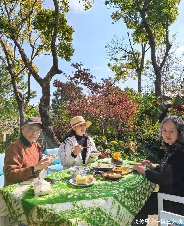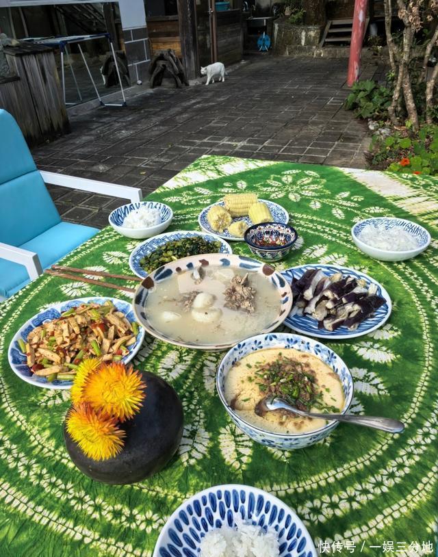 龚妈妈做饭很有一套,四菜一汤外加一个粗粮玉米,这样的家常菜最是暖人胃,龚琳娜还将餐桌摆到了户外,这样一边吃饭,一边晒太阳,伴着树叶鸟鸣,光是看着就能感觉到很舒服。