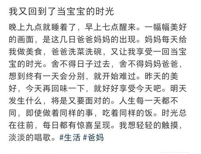 龚琳娜文案中写,早上七点起床就看到爸爸妈妈在为她忙活早餐,父母在的这几天都是妈妈做菜,爸爸洗碗,50岁的龚琳娜好像又做回了孩子,完全享受父母对她的爱。